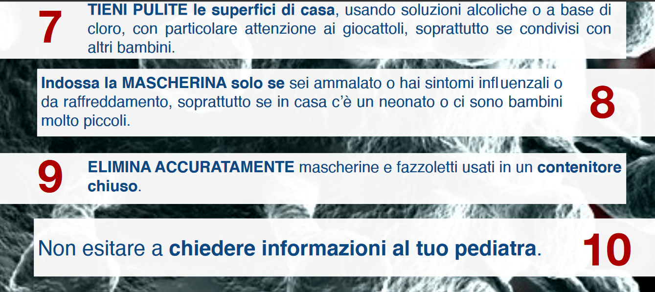 - Non utilizzare antivirali o antibiotici qualora non prescritto dal medico: entrambi sono inutili per questa forma di contagio, l’antibiotico non è infatti predisposto per i virus ma per i batteri.