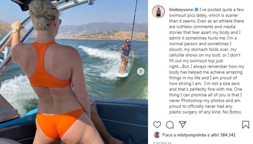 “Ultimamente ho postato alcune foto in costume da bagno, e si è rivelato più spaventoso di quanto avrei pensato. Anche come atleta ci sono commenti spietati e reazioni social che attaccano il mio corpo e ammetto che a volte mi fa male. Sono una persona normale e a volte mi ‘arrotondo’ un po’, la mia pancia fa le pieghe, compare della cellulite sul sedere o non riempio bene la parte superiore del costume … Ma ricordo sempre come il mio corpo mi ha aiutato realizzare cose incredibili lungo la mia vita e sono orgogliosa di quanto sono forte. Non sono una taglia zero e per me va benissimo. Una cosa che posso promettere a tutti voi è che non ho mai photoshoppato le mie foto e sono orgogliosa di non aver mai avuto ufficialmente alcun intervento di chirurgia plastica di alcun tipo. Niente Botox, niente riempitivi, niente mini interventi chirurgici. Letteralmente niente. Sono 100% naturale e 100% Lindsey. Quindi a chiunque si senta cosciente di sé o abbattuto per il proprio aspetto dico: sii forte, rimani in salute e ama te stesso, qualunque cosa dicano gli haters.