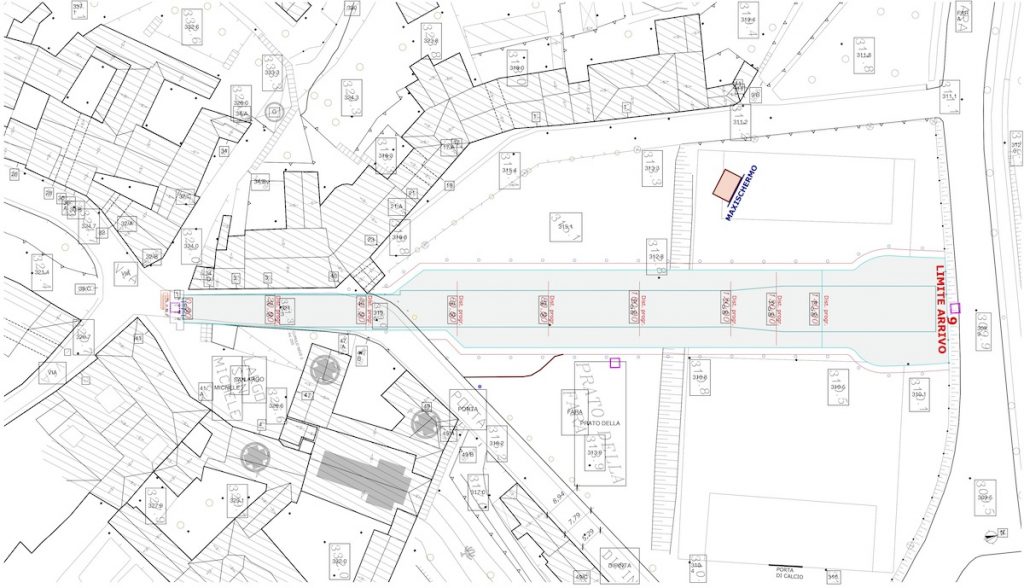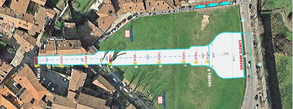 Partenza all’altezza del Pozzo Bianco, di fatto davanti al cancello del sindaco Gori, percorso attraverso il prato della Fara, arrivo della Sprint Line davanti alla chiesa sconsacrata di Sant’Agostino.